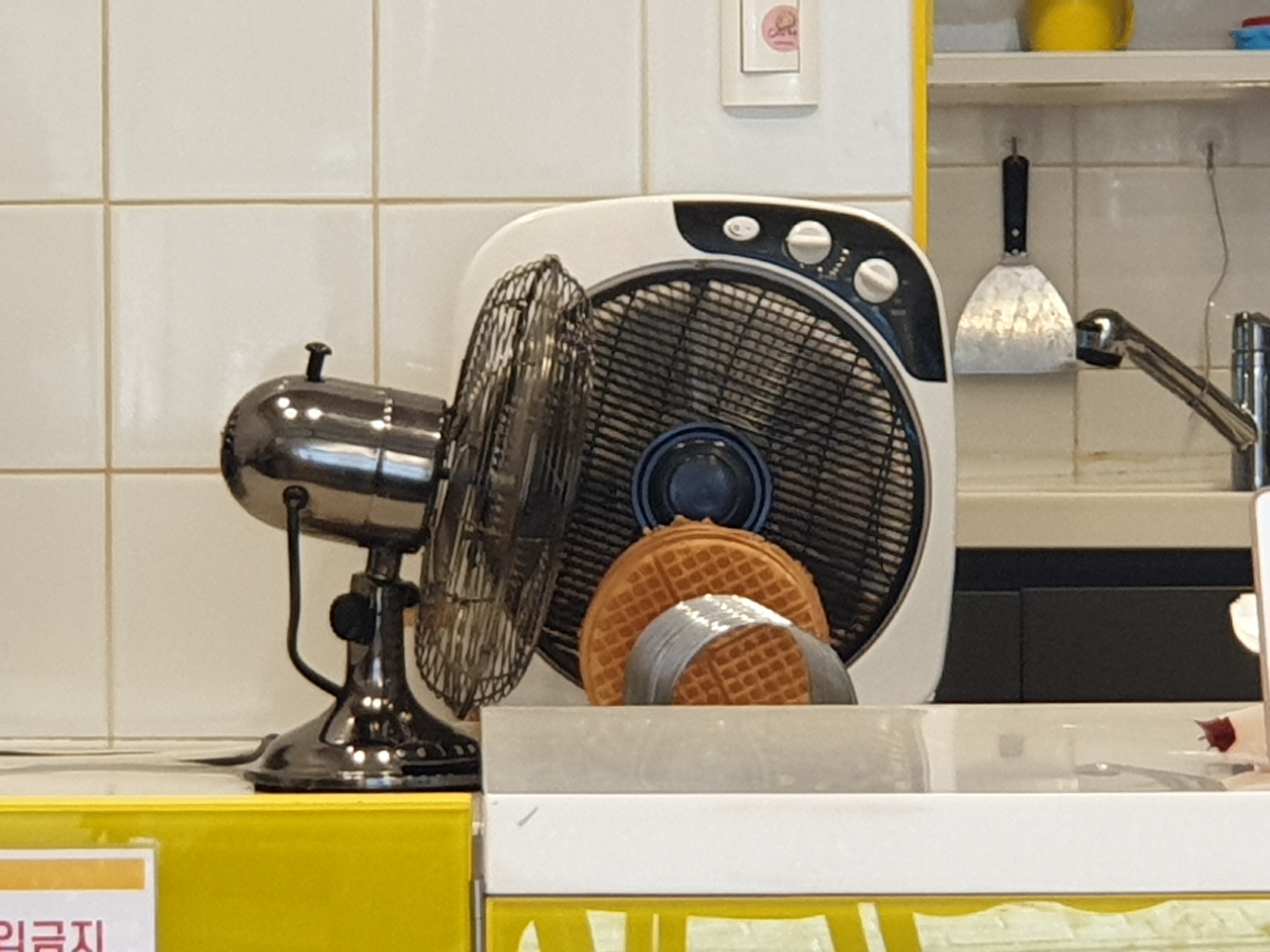 와플을 선풍기에 식히는 재밌는 광경을 보게 되었습니다^^