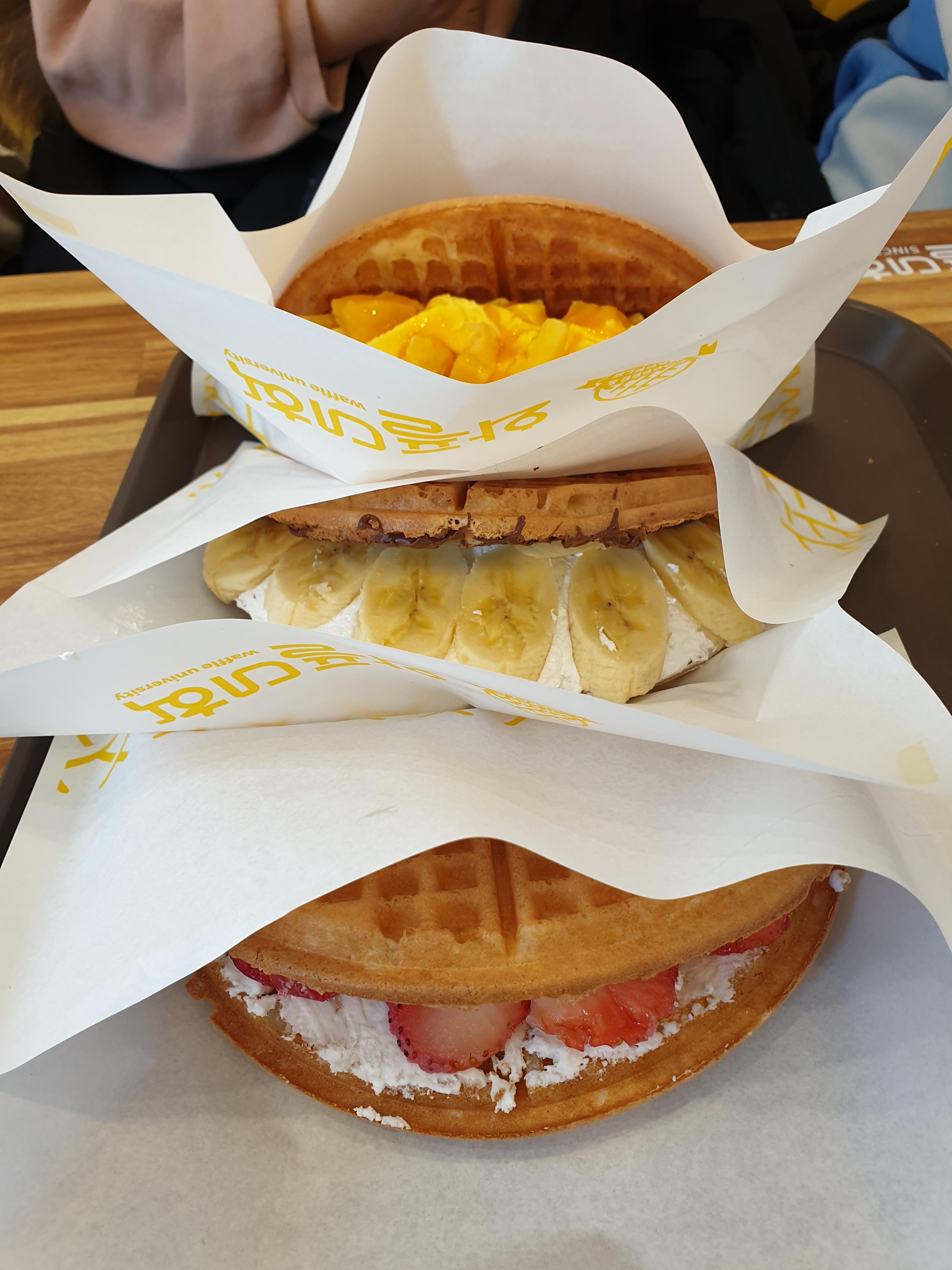 딸기와플, 바나나누텔라와플, 망고범벅젤라또와플 입니다.