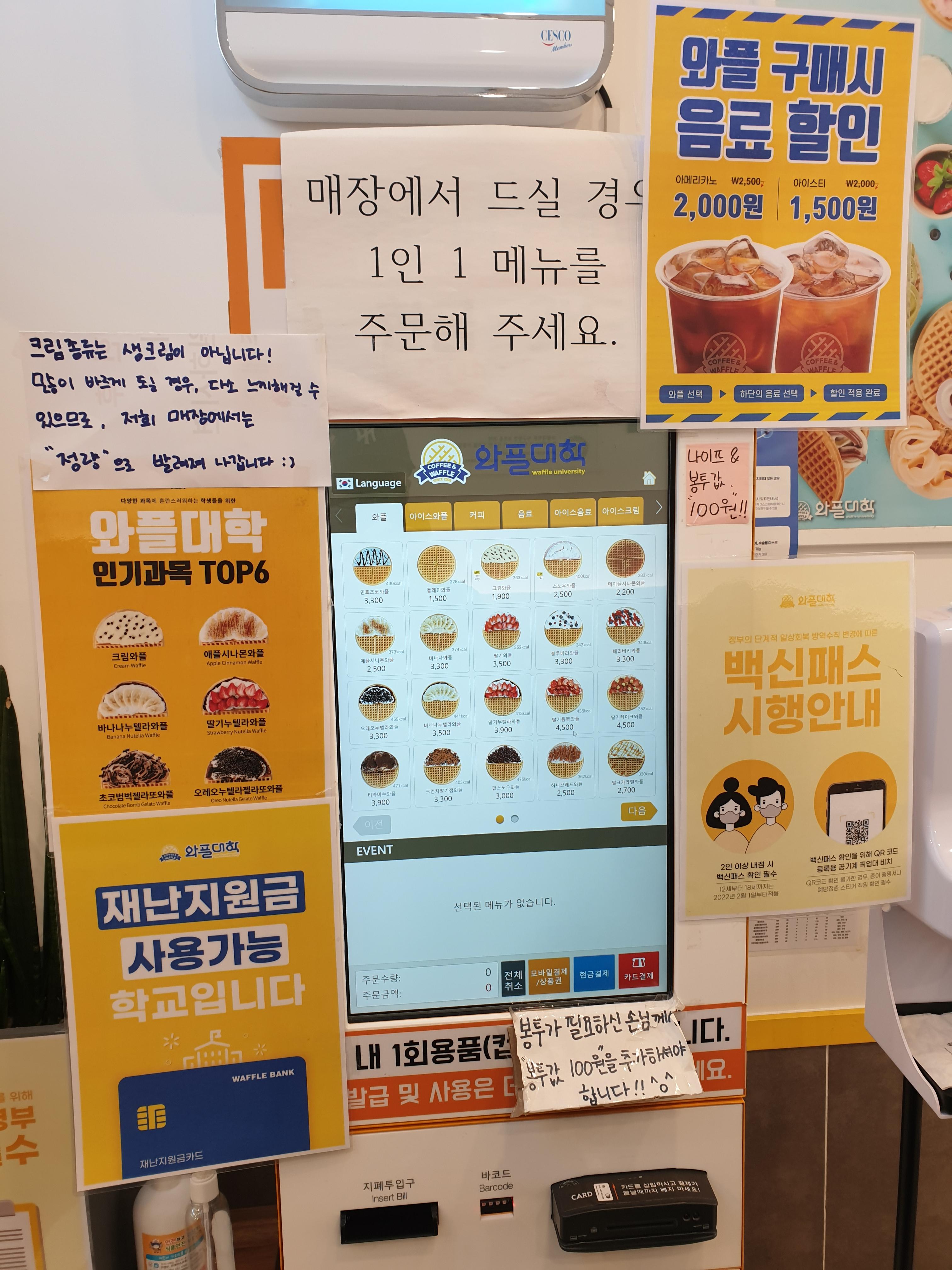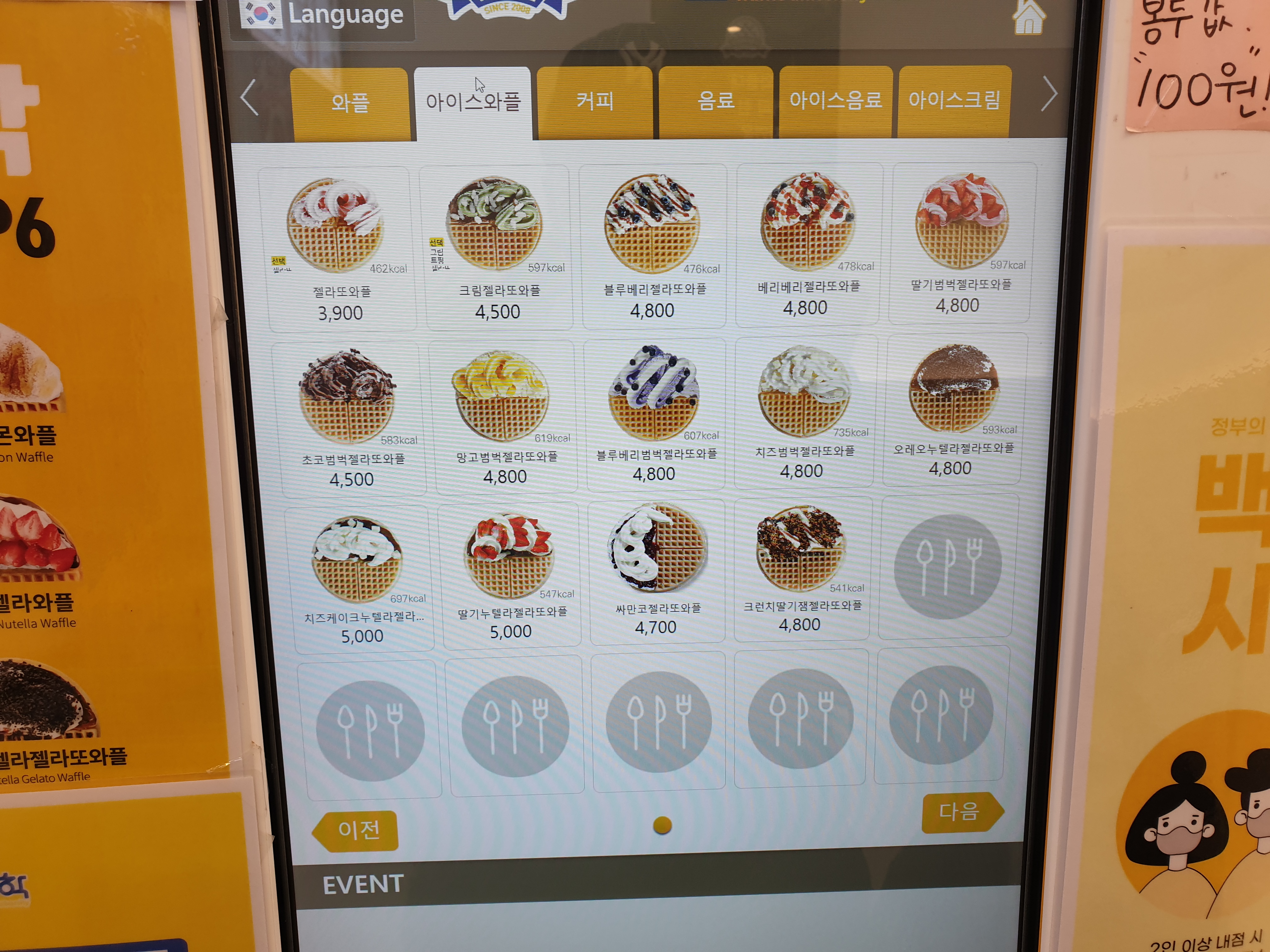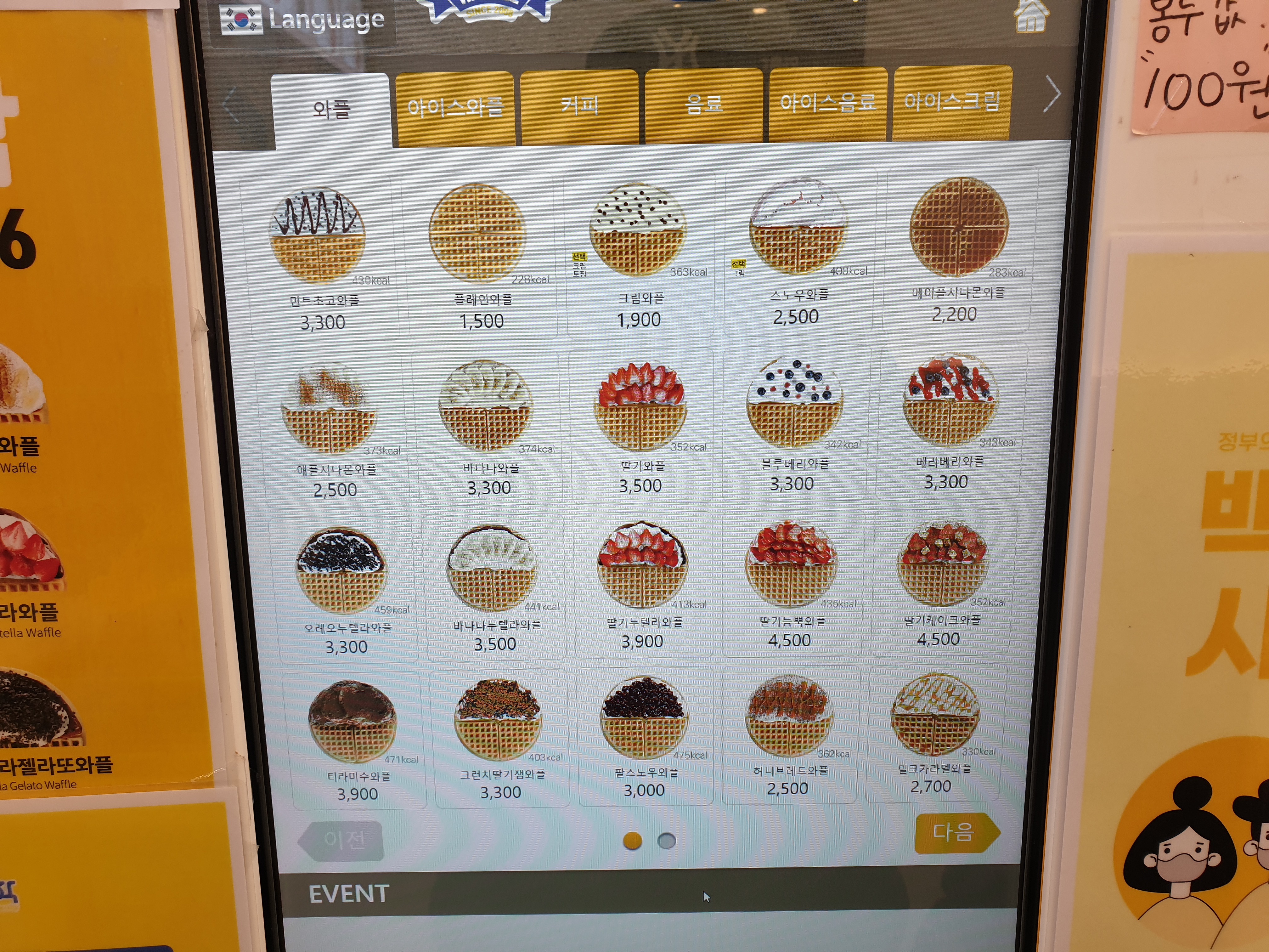 키오스크에는 와플 2페이지, 아이스와플 1페이지로 되어있었습니다.