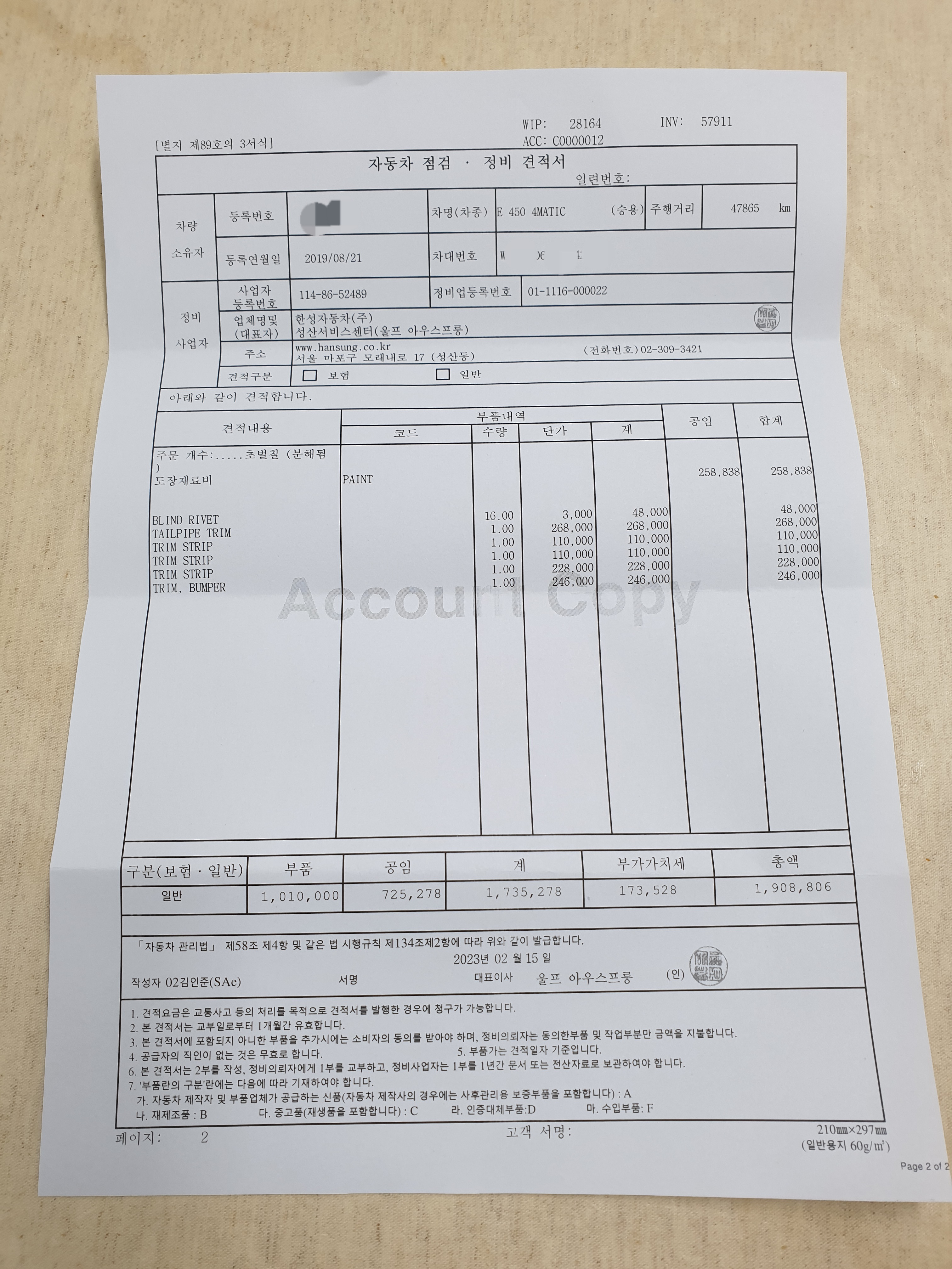 한성자동차 메르세데스벤츠 성산서비스센터에 가서 견적을 물어보니..