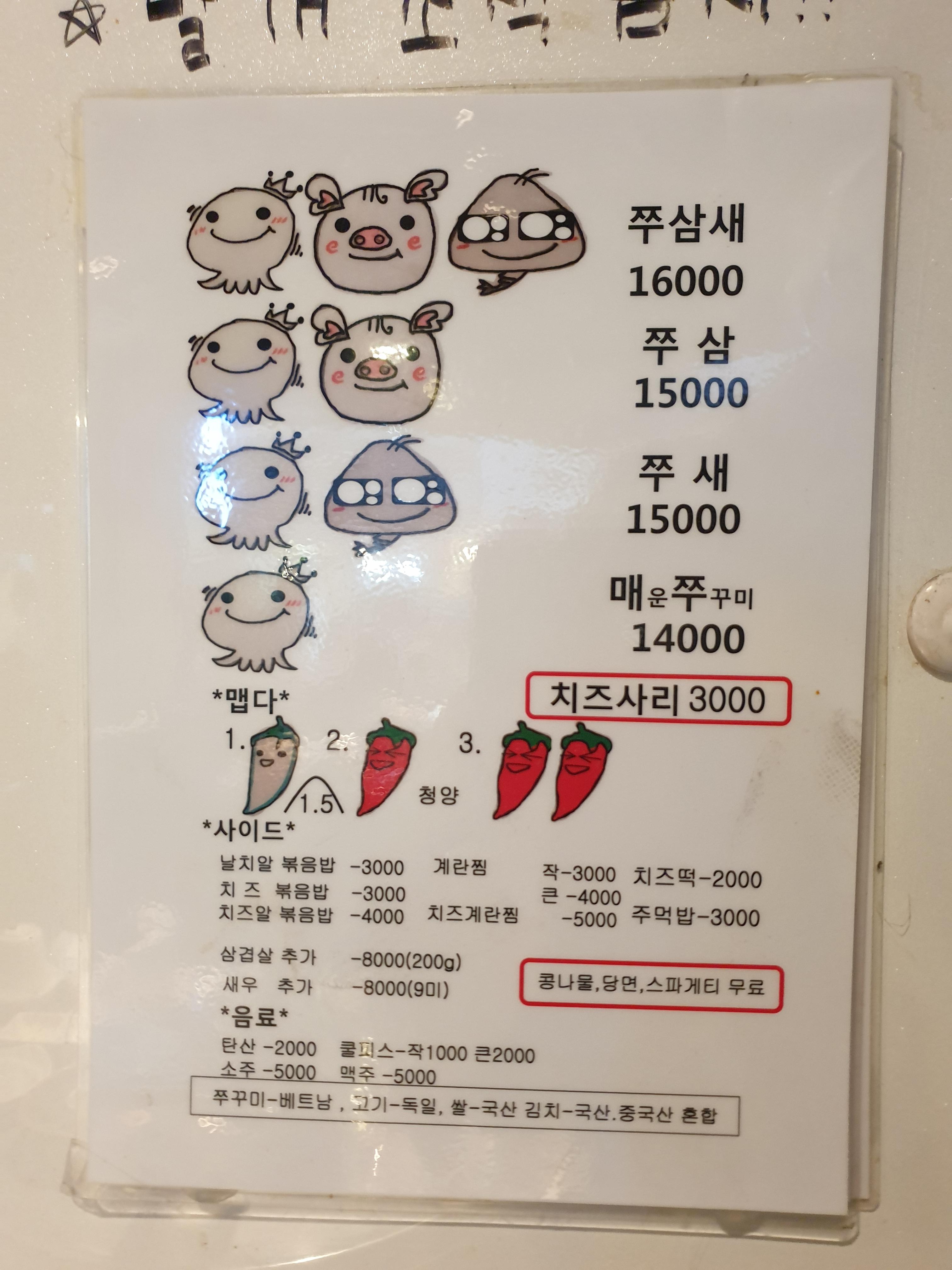메뉴는 매운쭈꾸미, 그리고 쭈삼(쭈꾸미+삼겹살). 쭈새(쭈꾸미+새우), 쭈삼새(쭈꾸미+삼겹살+새우) 이렇게 있구요.