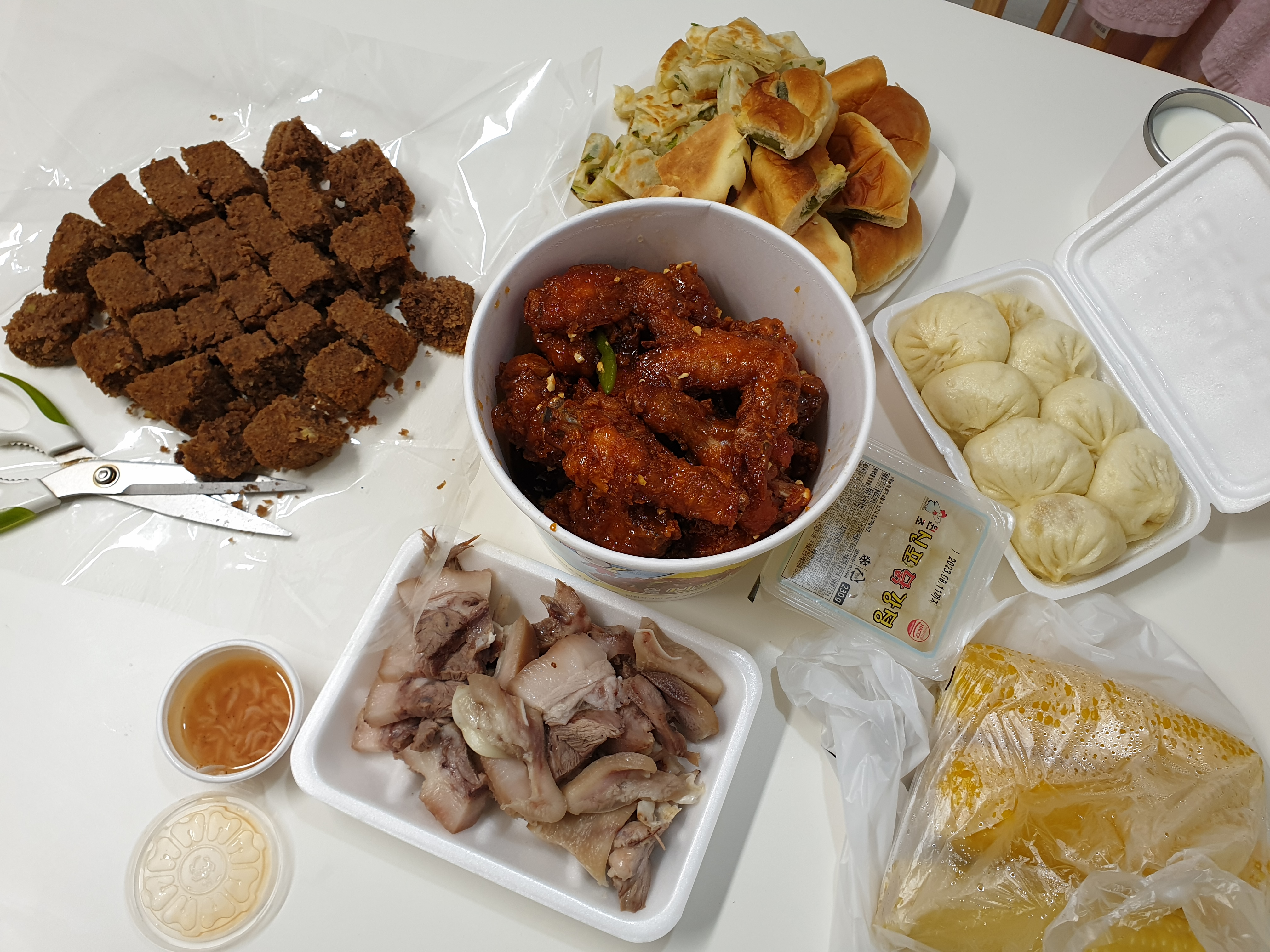 닭강정 외에 빵이랑 머릿고기, 옥수수, 만두도 사와서 저녁상을 차렸어요~~