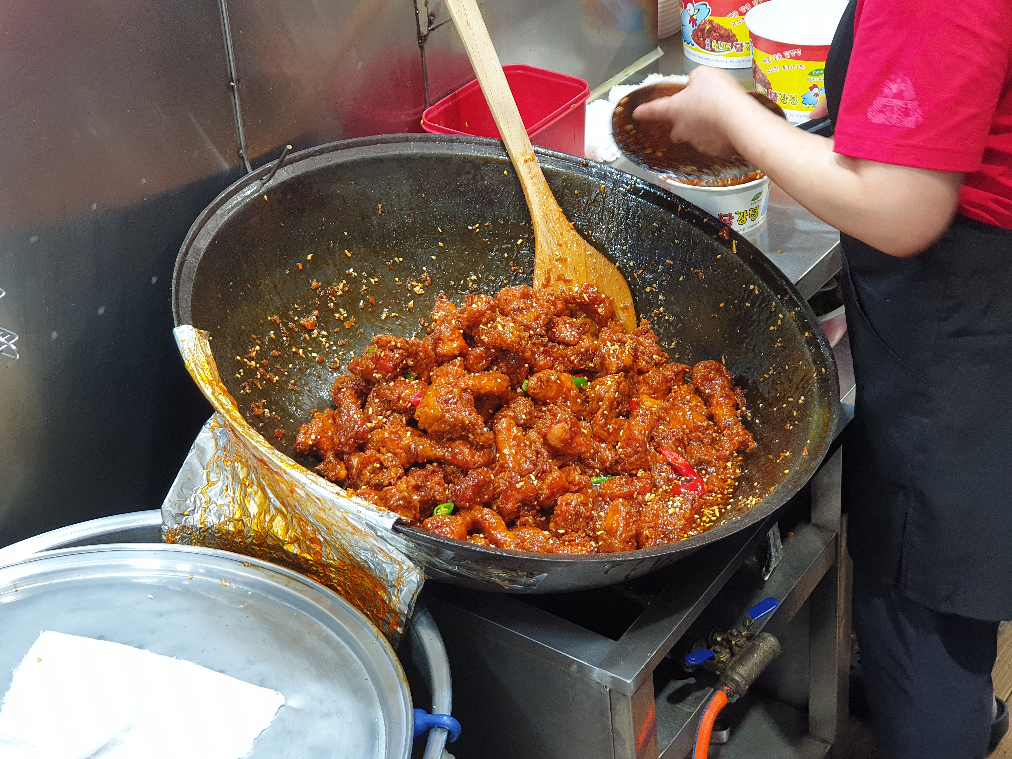 줄이 꽤 길긴 했지만 끊임없이 튀기고 끊임없이 버무리고 끊임없이 주문 받고..