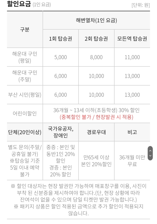 이용요금은 스카이캡슐, 해변열차(1회권,2회권,다회권)으로 나뉘는데 할인은 현장발권만 가능하다는거ㅜㅜ