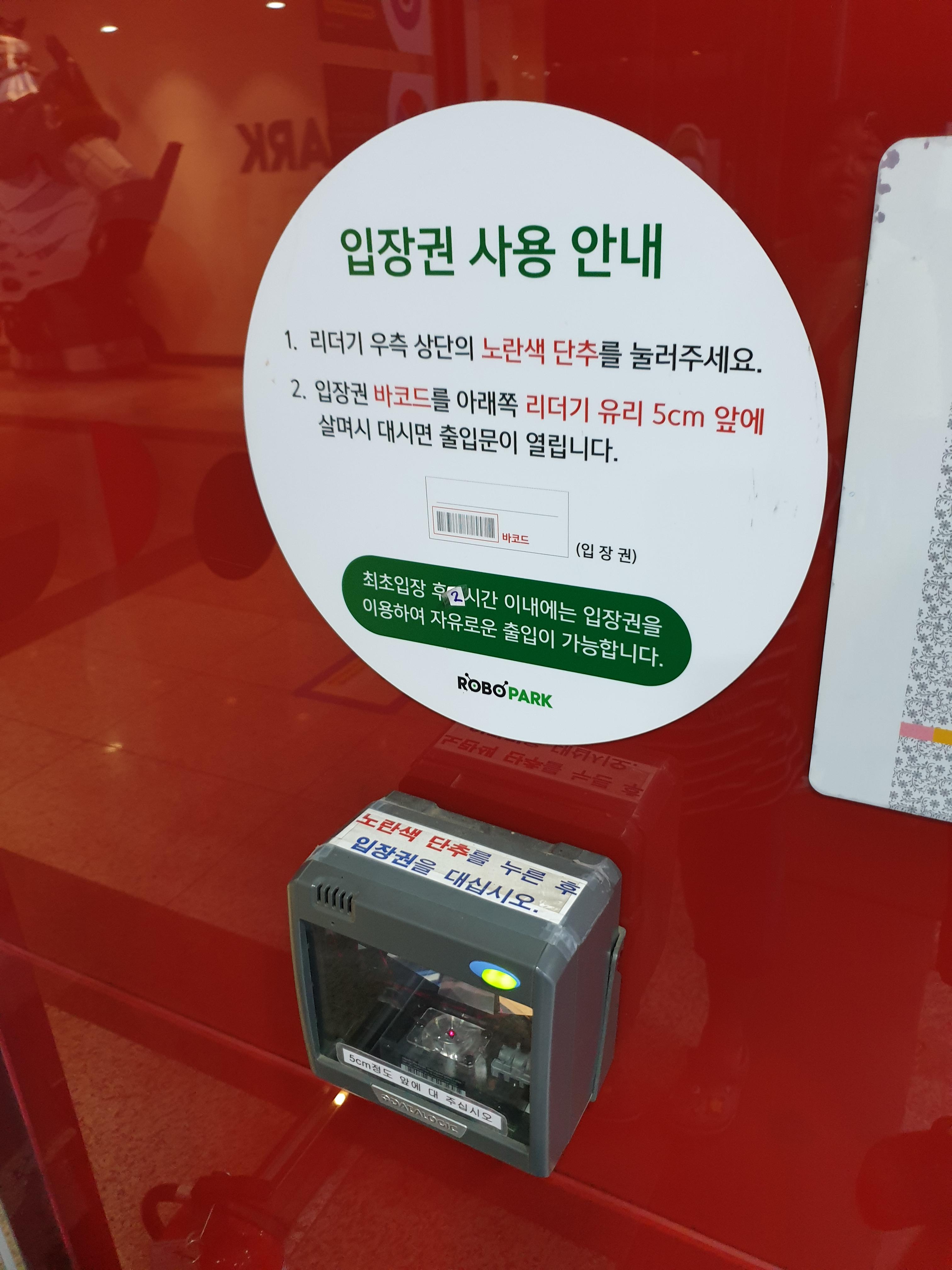노란색 단추를 누르고 입장권의 바코드를 읽혀주면 문 열려요~~