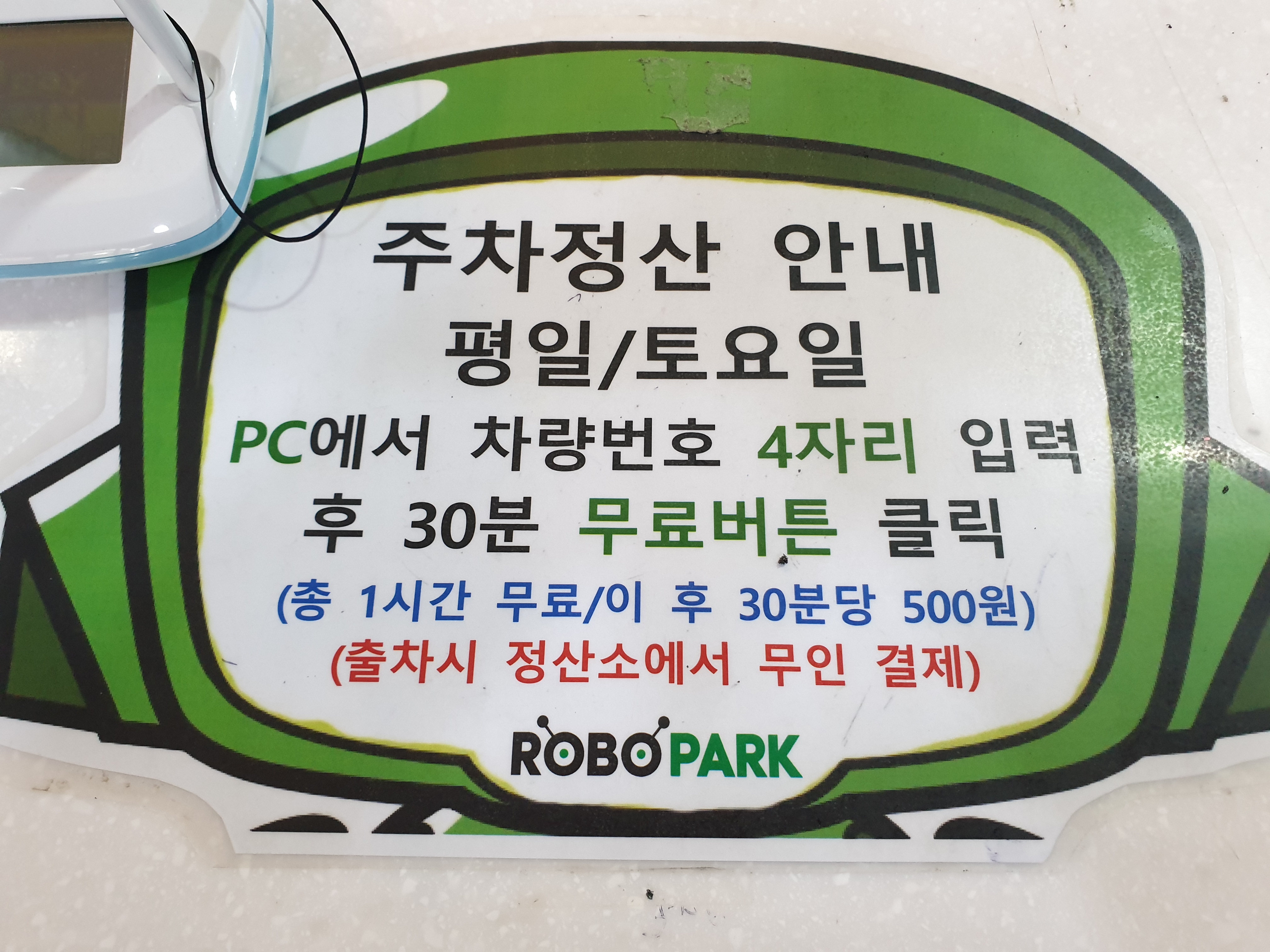 평일과 토요일에는 1시간 주차 무료 / 이후 30분당 500원인데, 일요일에는 주차할인 없이 3시간에 1천원이예요~~!!